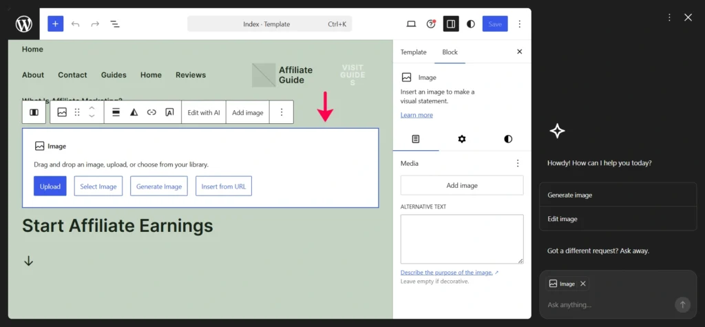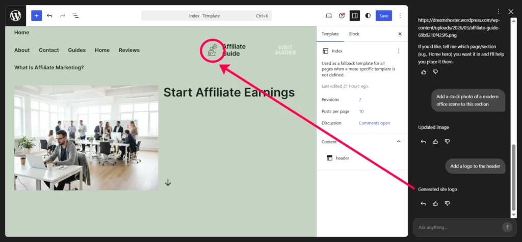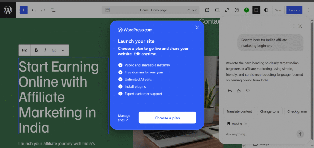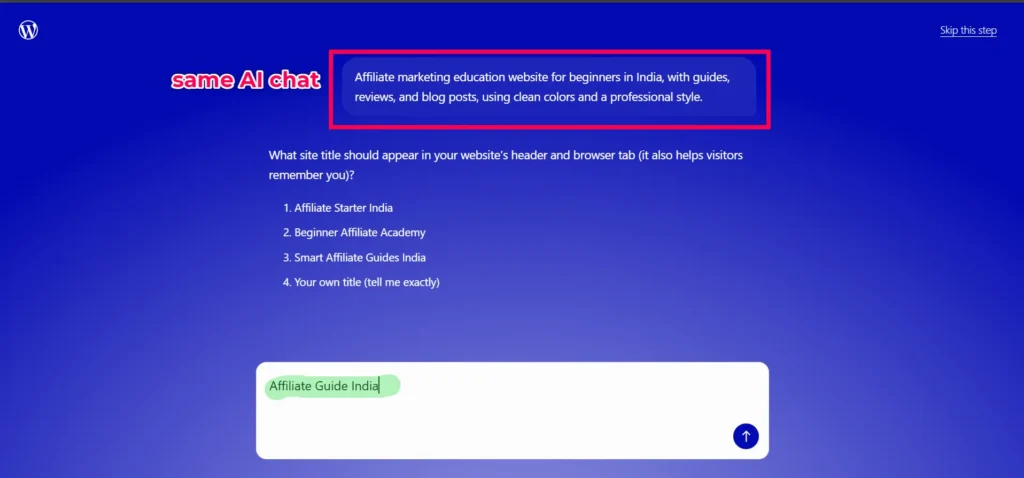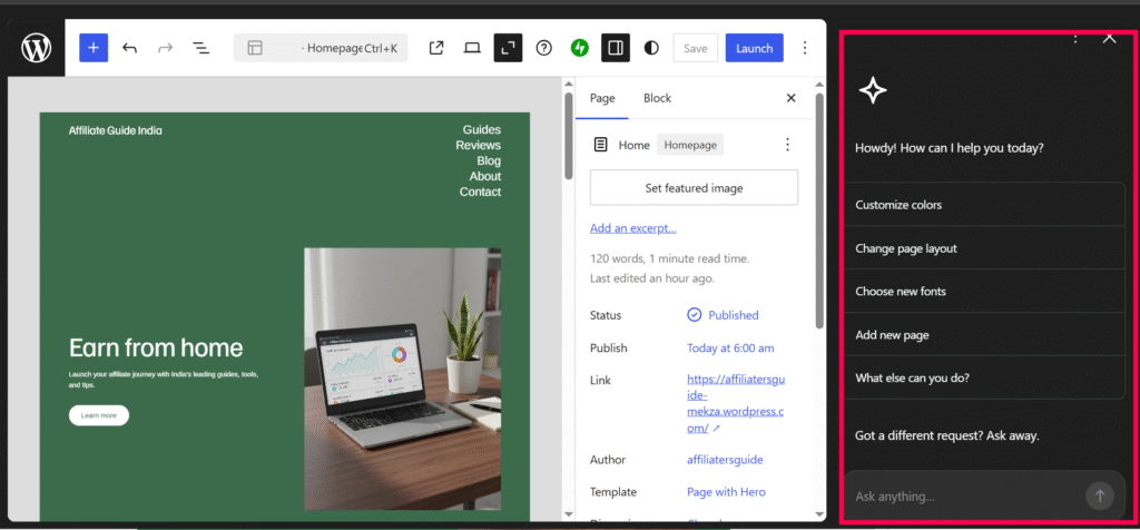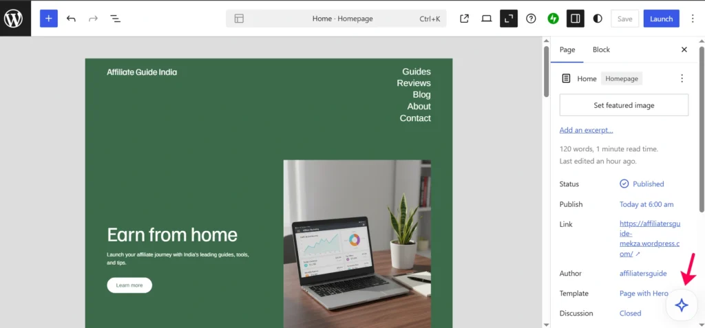 For this step-by-step tutorial, I’m using my own domain AffiliateGuide.in to show you how to build a website with the WordPress.com AI Website Builder. Whenever you see AffiliateGuide.in in the screenshots or examples, simply replace it with your own domain name.