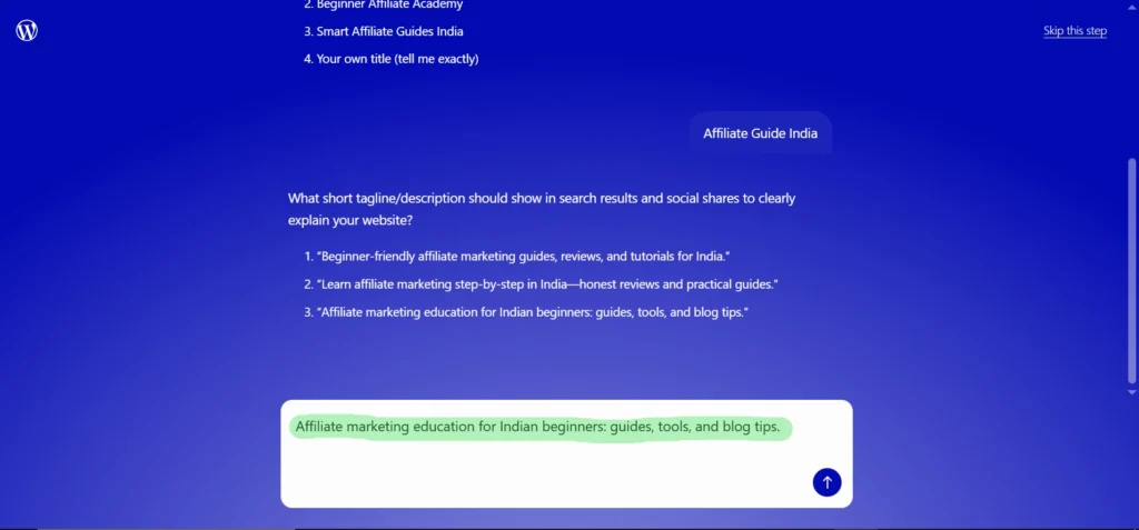 During the setup, the AI suggests a few tagline options that will appear in search results and social media previews.