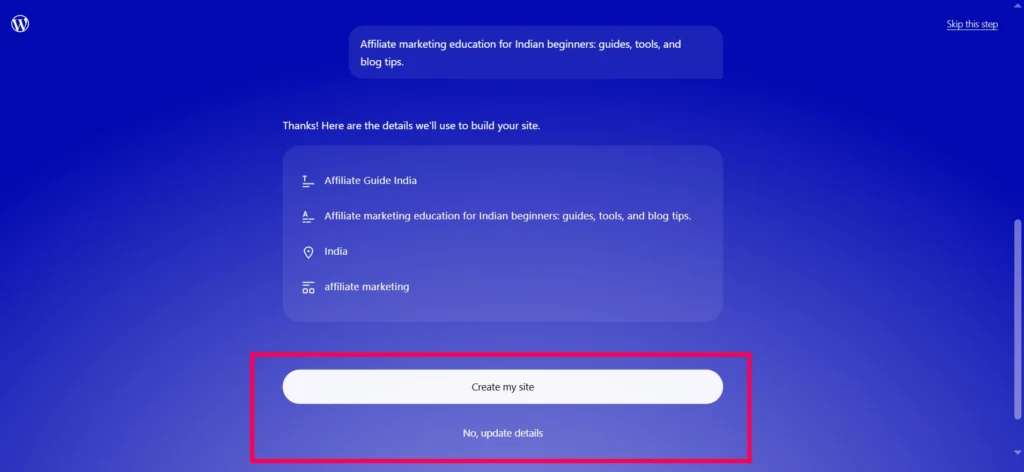 When the AI has gathered enough information, I see a button labeled Create my site. I click that button to begin the automatic website creation process.