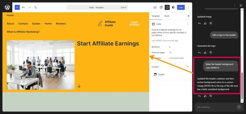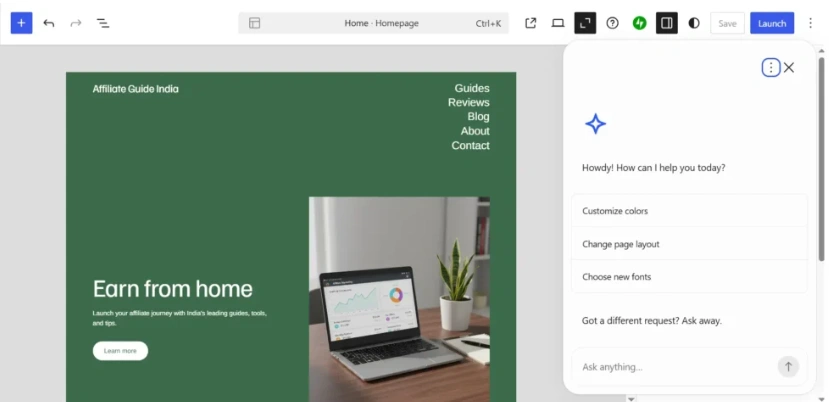 - When I am adjusting the site layout or colors, I use the AI prompt box to request changes instead of hunting for every setting manually.