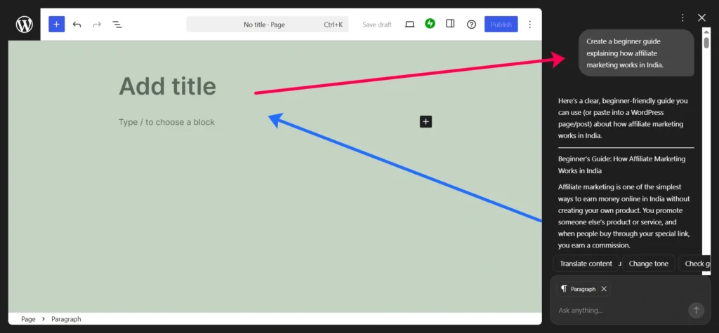 - When I am editing a page or post, I look for the AI assistant icon at the bottom and click it whenever I want help writing or rewriting text.