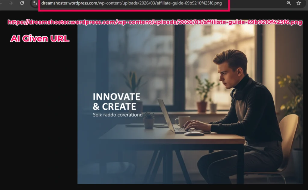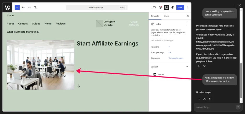 Based on that short description, the AI generated a new landscape hero image of a person working on a laptop and saved it directly into my Media Library.