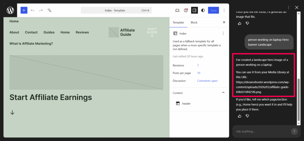 It even returned the exact media URL so I could reuse it later, and offered to help place the image into a specific section, such as the homepage hero, if I told it which page or block I wanted to update. It’s fun to see AI create exactly what sparks your interest!