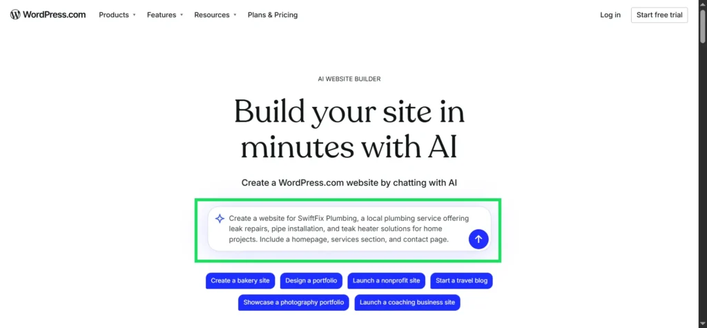 Figure: Entering a simple prompt in the WordPress.com AI Website Builder to generate a business website.