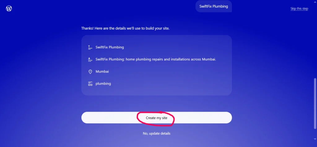 Figure: Clicking Create my site to start generating the website based on the prompt and business information provided.