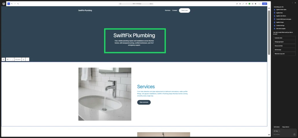 Figure: The AI-generated homepage preview for SwiftFix Plumbing. Within minutes, the WordPress.com AI Website Builder creates a structured layout with a headline, service section, and navigation that can be refined and customized before publishing..